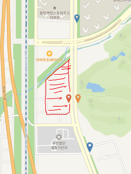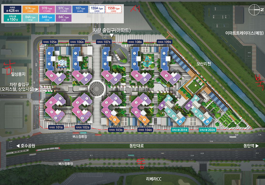 오산리 천이 북서쪽으로 있어서 그런지 아파트 단지에서 잘 안 보이는 북동, 북서향이 있습니다.