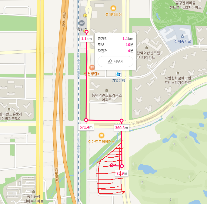 우선 가장 중요한 동탄역까지의 도보거리입니다.