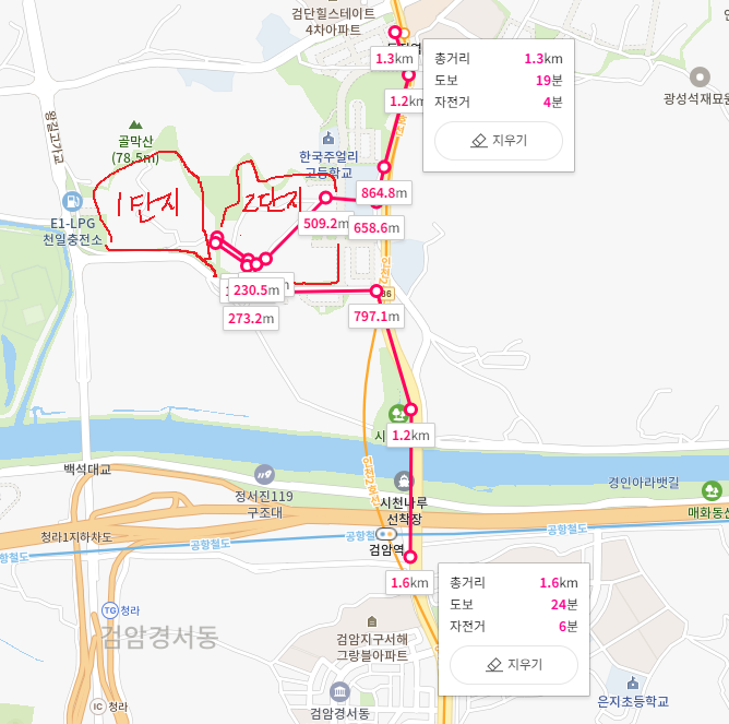 1단지와, 2단지의 중간에서 위쪽의 독정역과 아래쪽의 검암역까지 각각 1.3km, 1.6km로 도보권은 아닙니다.