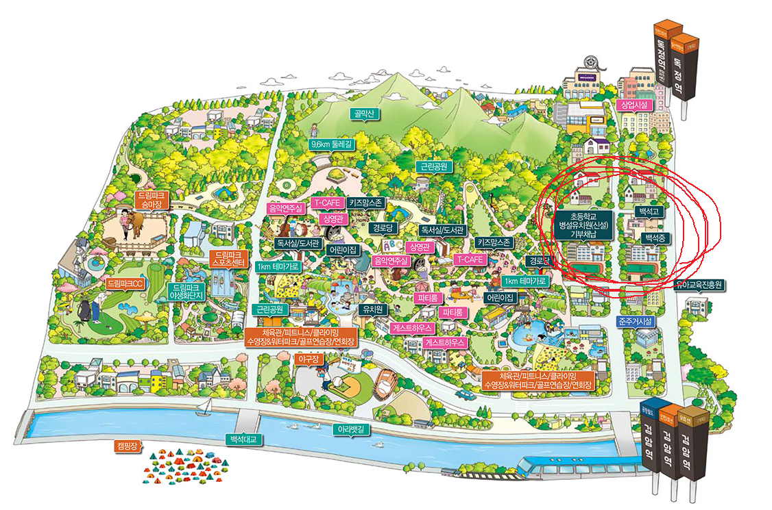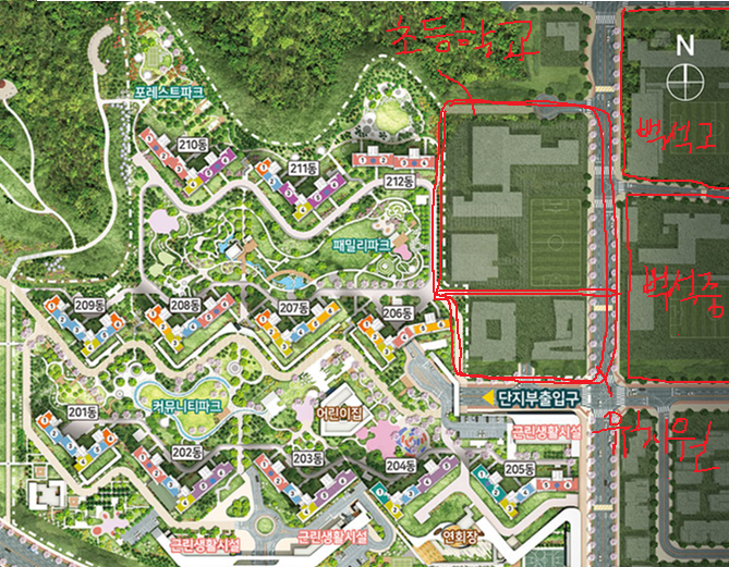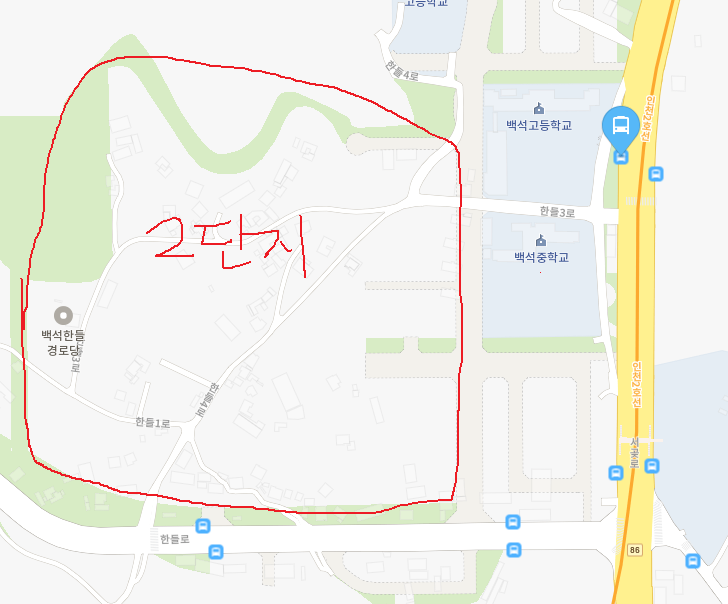 오른쪽에 백석중, 백석고가 있으니 바로 왼쪽에 운동장을 끼고 있는 곳이 초등학교 부지가 될 것이고 그 아래의 부지가 병설 유치원이 들어설 자리로 보입니다.