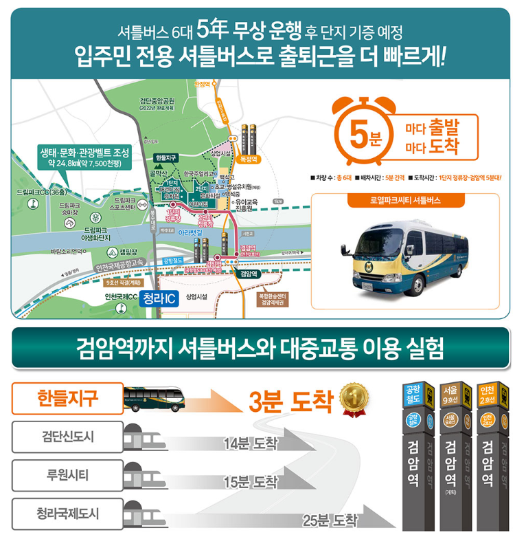 1단지-2단지-검암역까지의 노선이며 5분마다 출발이라고 하니, 위쪽의 독정역을 가지 않는 것은 아쉽지만