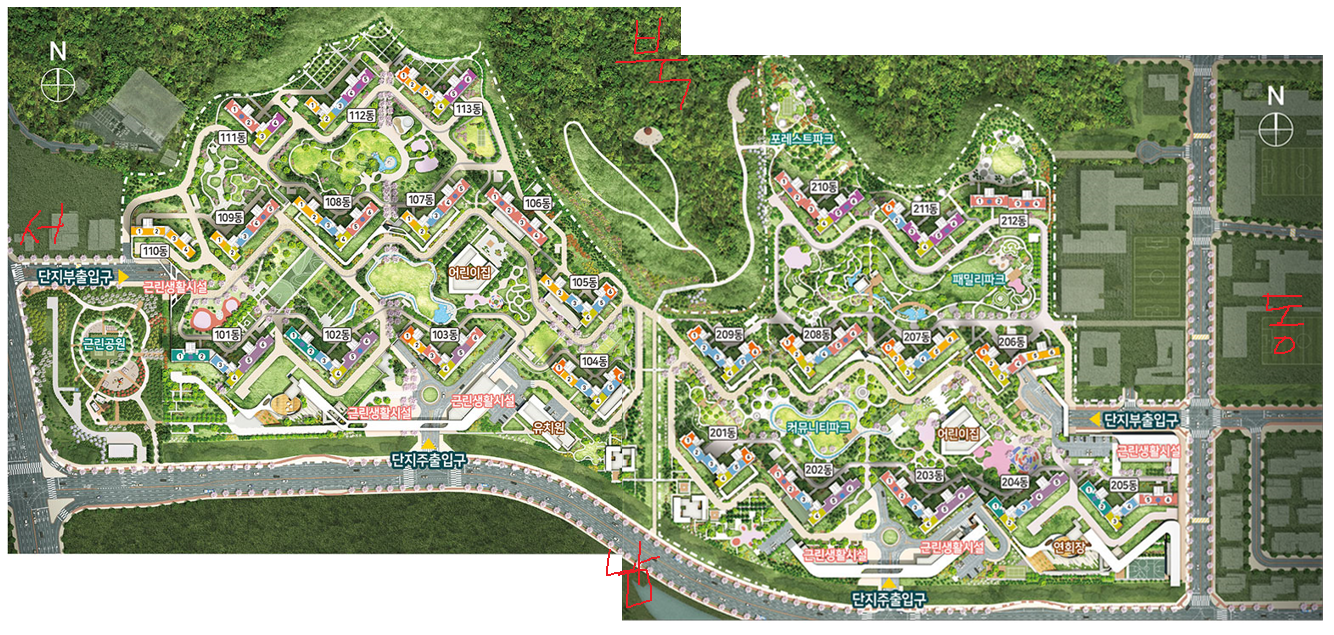 이제부터 아파트 향, 교육환경, 생활특권, 교통 이 네 가지를 비교해보며 로얄동, 로얄층을 알아보도록 하겠습니다!