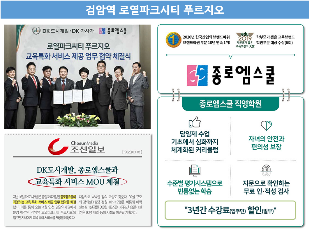 그리고 종로엠스쿨과 MOU를 체결하여 검암역 로열파크시티 푸르지오의 입주민 자녀에게 '교육특화 서비스'를 제공할 예정이라 합니다. 강당 및 강의실 등의 시설도 마련할 계획이라는데, 가능한 단지 내에서 아이들의 교육이 모두 해결될 수 있도록 하기 위한 노력으로 보입니다.