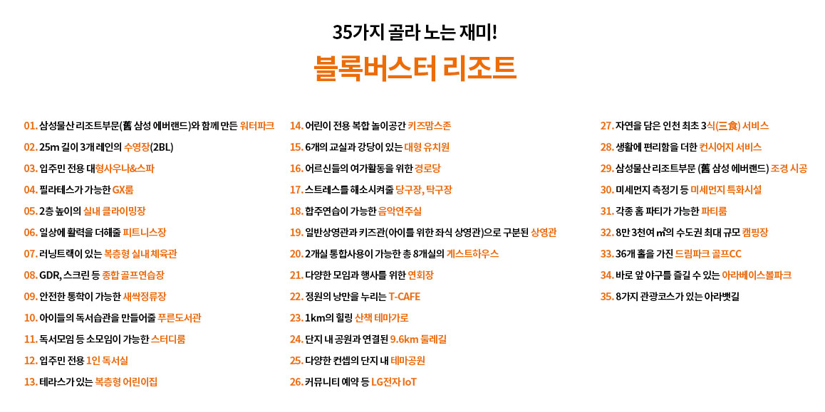 총 35가지의 특권을 누릴 수 있으며 가짓수가 많은 만큼 공식 홈페이지에서는 '블록버스터 리조트'라고 표현하고 있습니다.