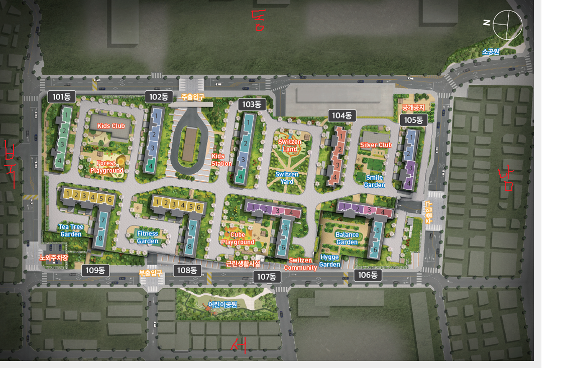 초등학교, 중학교의 위치를 감안할 때는 107~109동의 84 타입 라인과 102, 103동까지가 괜찮아 보입니다.