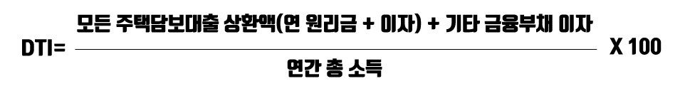 DTI란 '총부채상환비율'로 연간 총 소득에서 부채의 연간 원리금 상환액이 차지하는 비율을 말합니다.