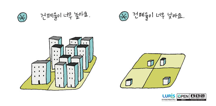위에 보시는 이미지처럼 건폐율이 너무 높으면 한정된 토지에 집들이 빽빽하게 들어설 것이고,
