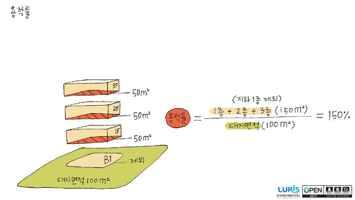 위 그림의 예시는 대지면적이 100㎡인 토지에 한층 당 50㎡씩 3층까지 지어서 용적률은 150%가 됩니다.